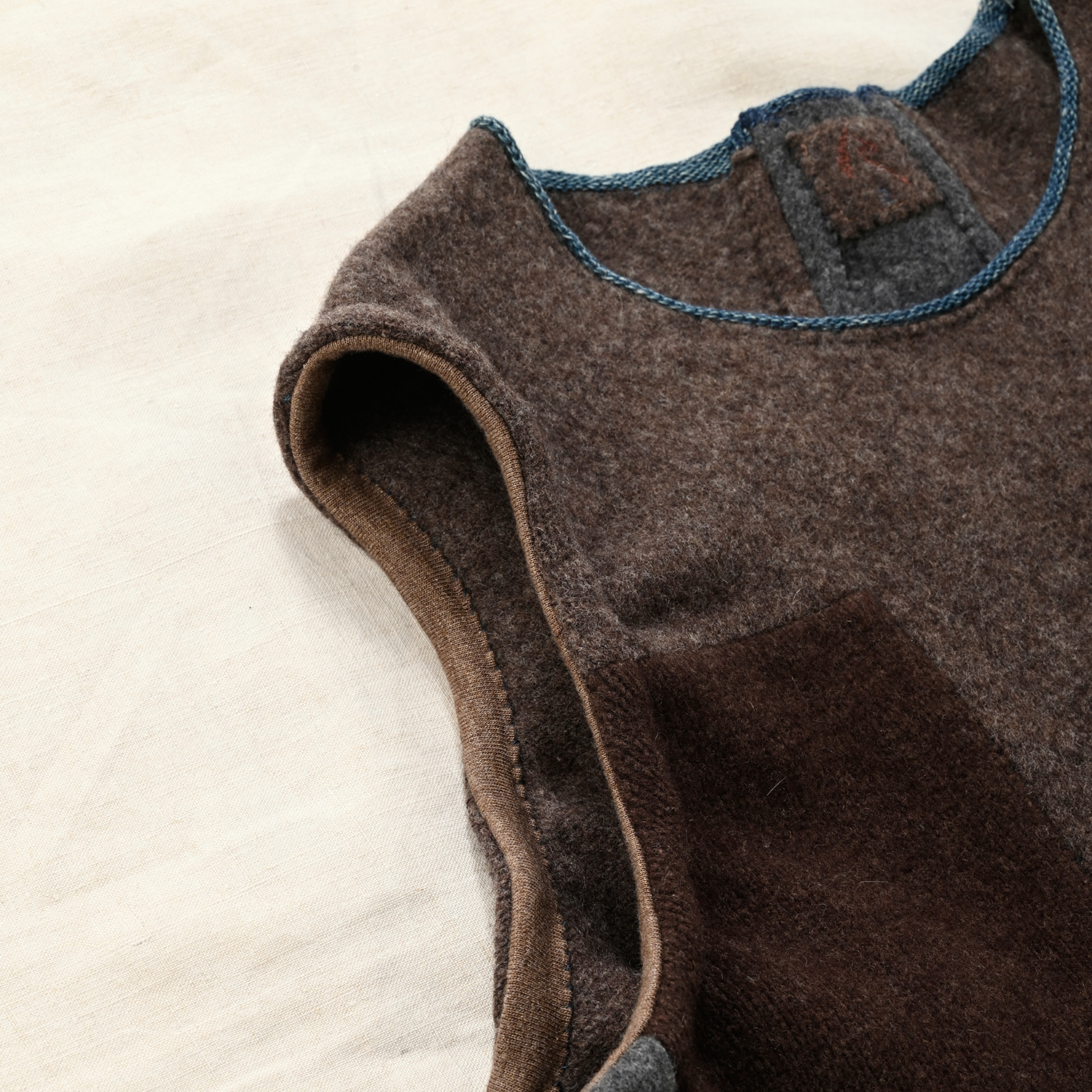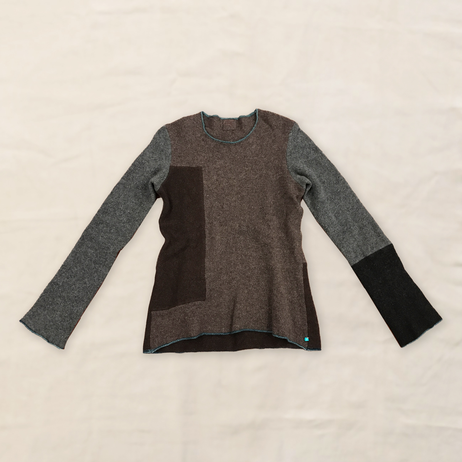 実はこれ、間違って洗濯してしまった縮んだセーターの仕立て直しです。そのままでは着ることができないので、袖を外し、その生地を再利用して背中と両脇にツギハギしました。元のデザインを活かしつつ、新たな1枚の完成です。