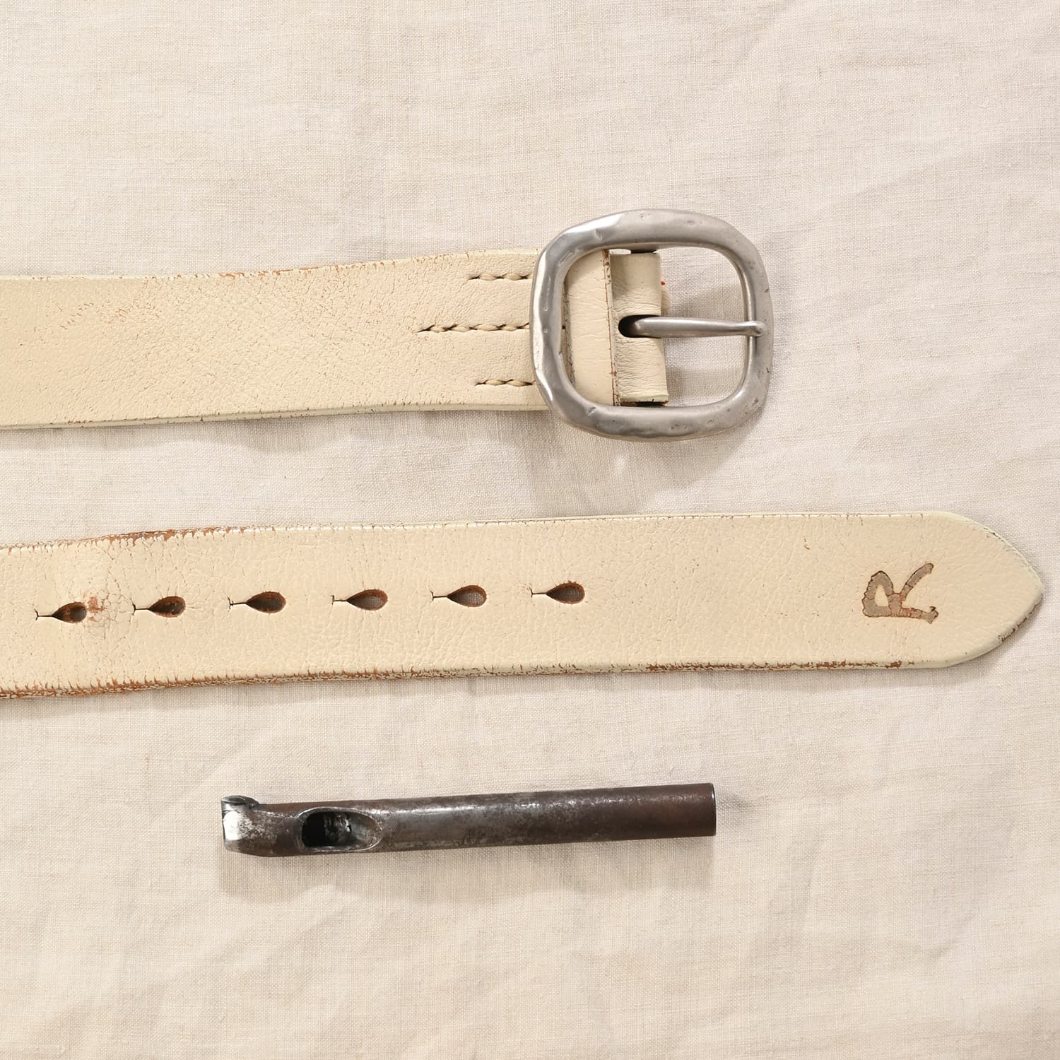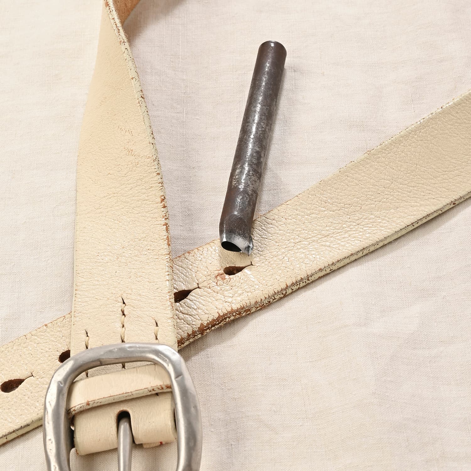 使い込んで柔らかくなったレザーは、伸びてしまうこともありますよね。 そんなときは、満足工房にてベルト穴の追加を承ります。