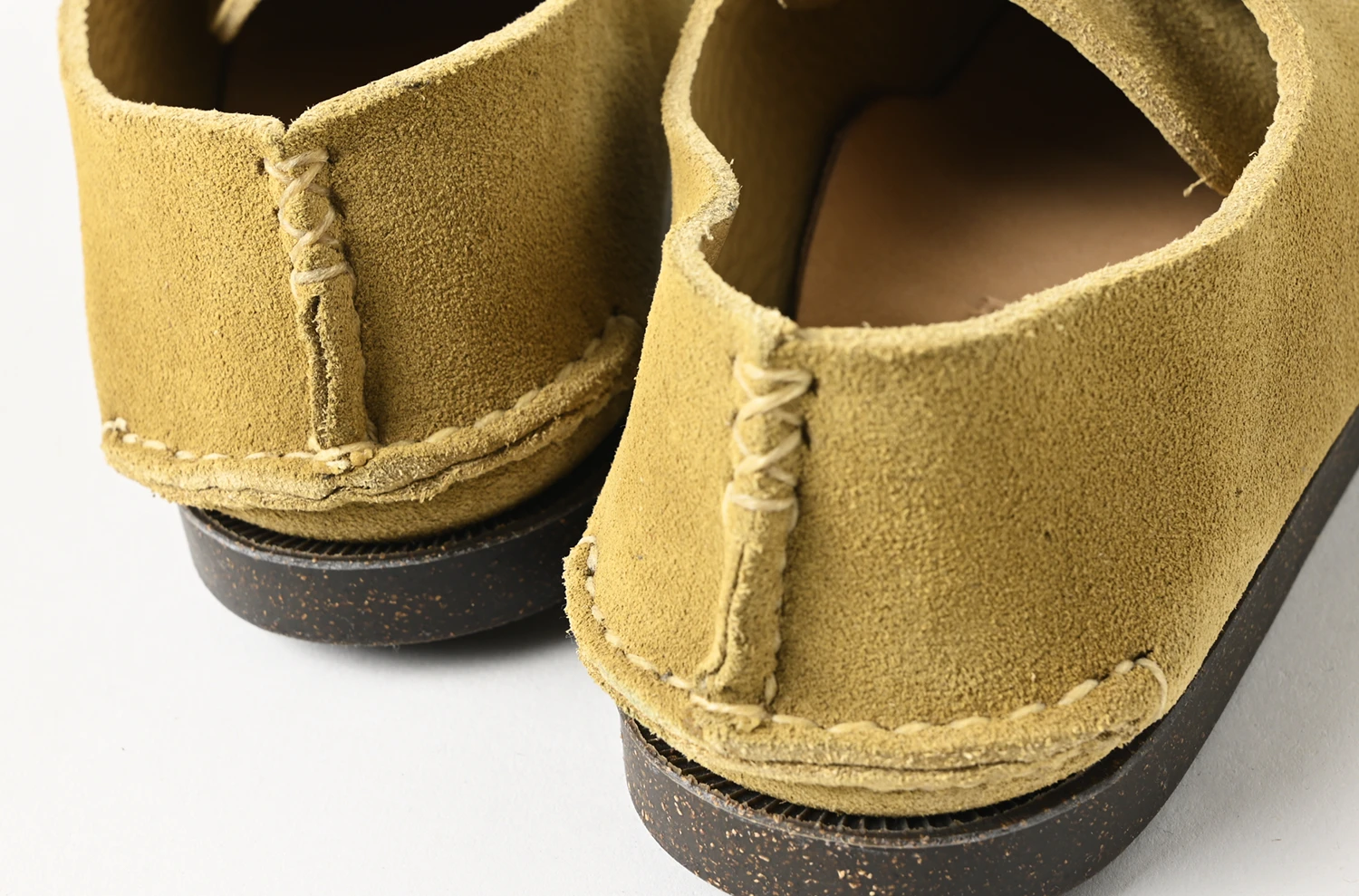 YUKETEN ならではのオリジナリティは、表からは見えない部分へも反映されています。その一つが、ヴァンプの踵部分の切り込み。インソールユニットで隠れてしまうため、表からは見えない部分です。ヴァンプパーツを裁断する際に踵部分に切り込みを入れて、アッパーを成型した後にその切れ込みをぎゅっと引き合わせて縫い付けます。このひと手間により、足によりフィットするワンランク上のフィット感が生まれます。
