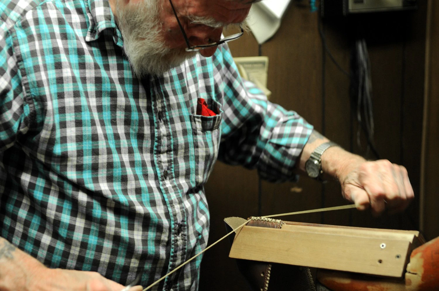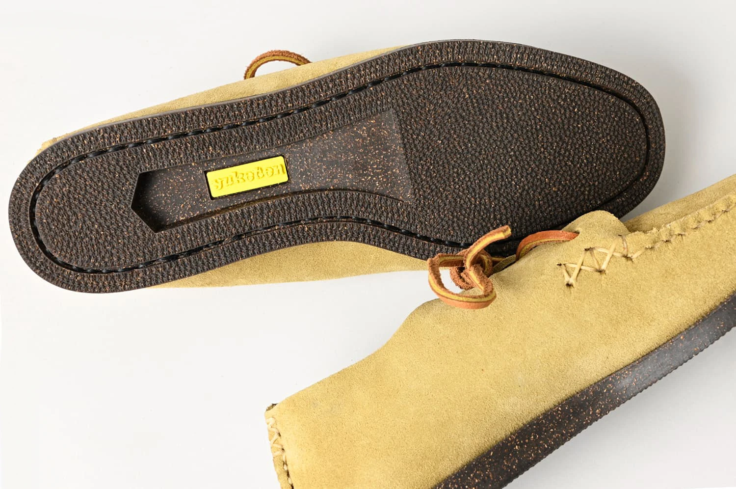 YUKETENのトゥルーモカシンのアッパーは、ヴァンプと呼ばれるアッパーの底部分が一枚革となっており下から足を包み込むように木型にしっかりとつり込み、プラグと呼ばれる甲部分と合わせて手縫いで仕上げられます。