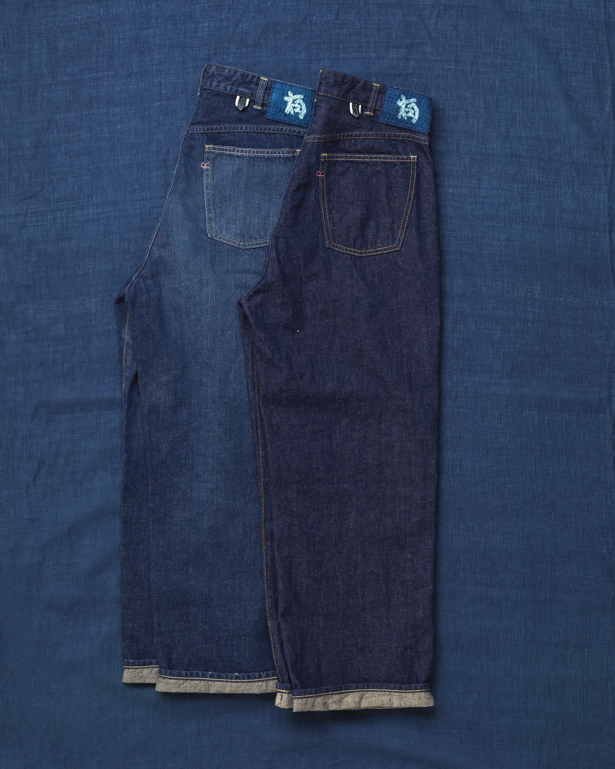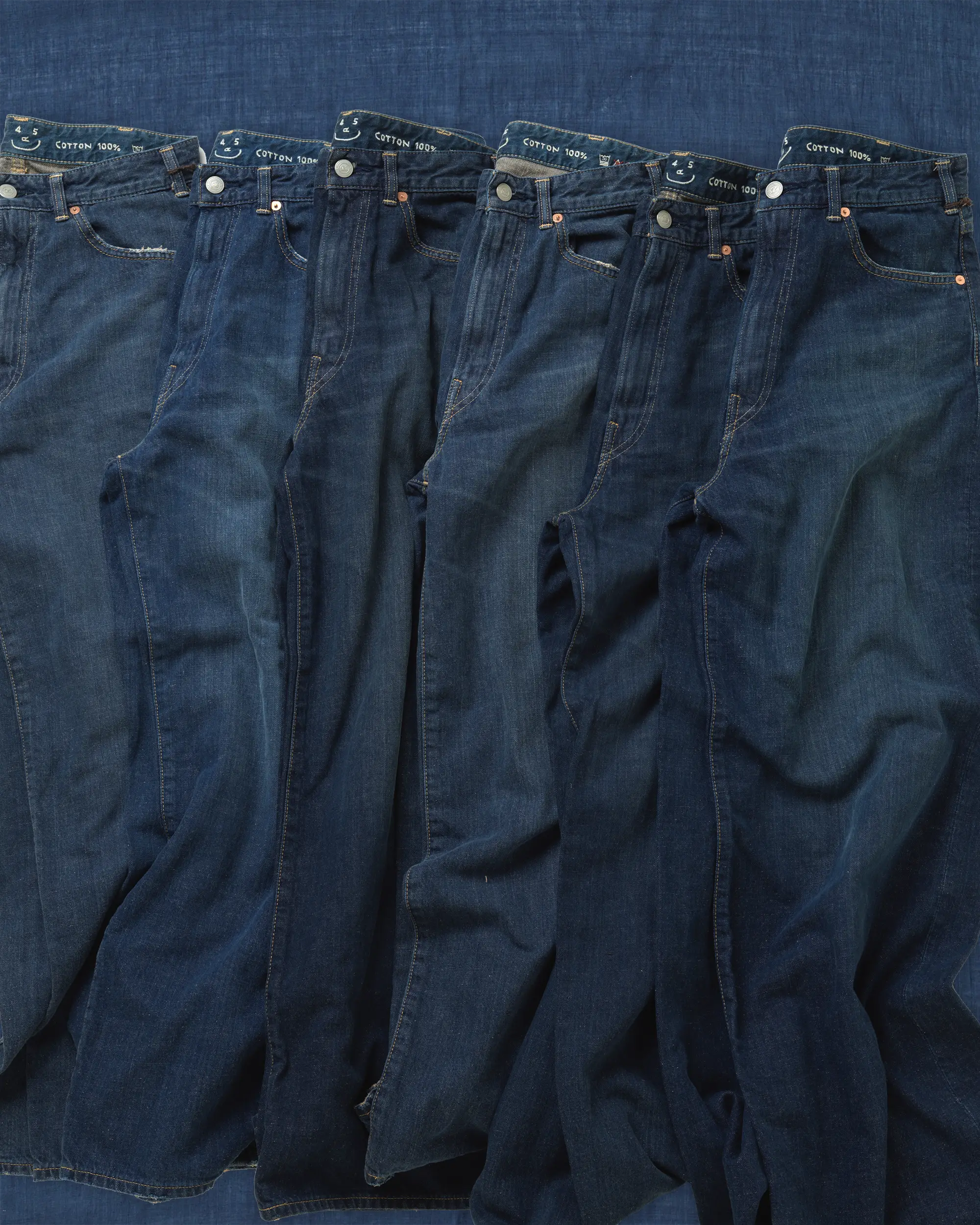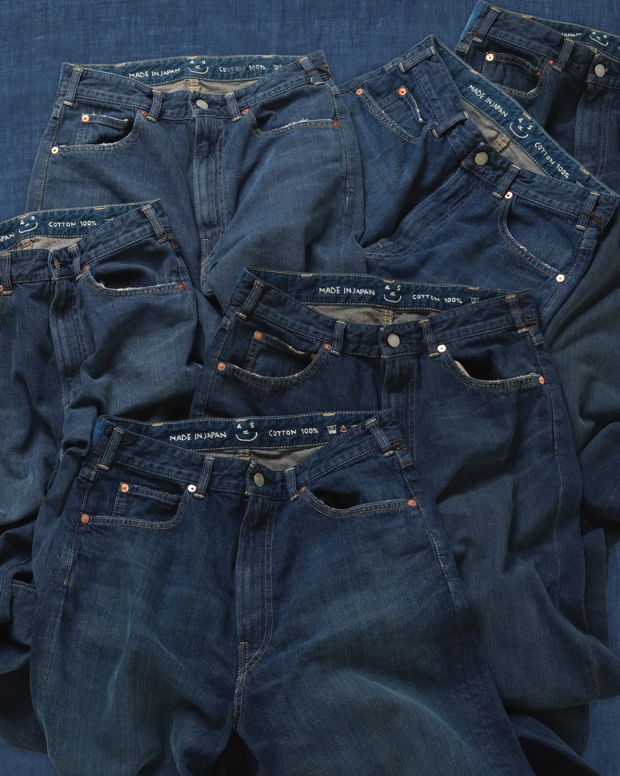 お披露目するのは、やわらかく穿きやすいライトオンスの藍デニム。かたちは45Rの定番、ややワイドな「シャルロット5」とバギーシルエットの「バチ比女」です。色はふたつとして同じ表情がなく、すべて手作業よる加工で、さまざまな色合いに仕上げました。