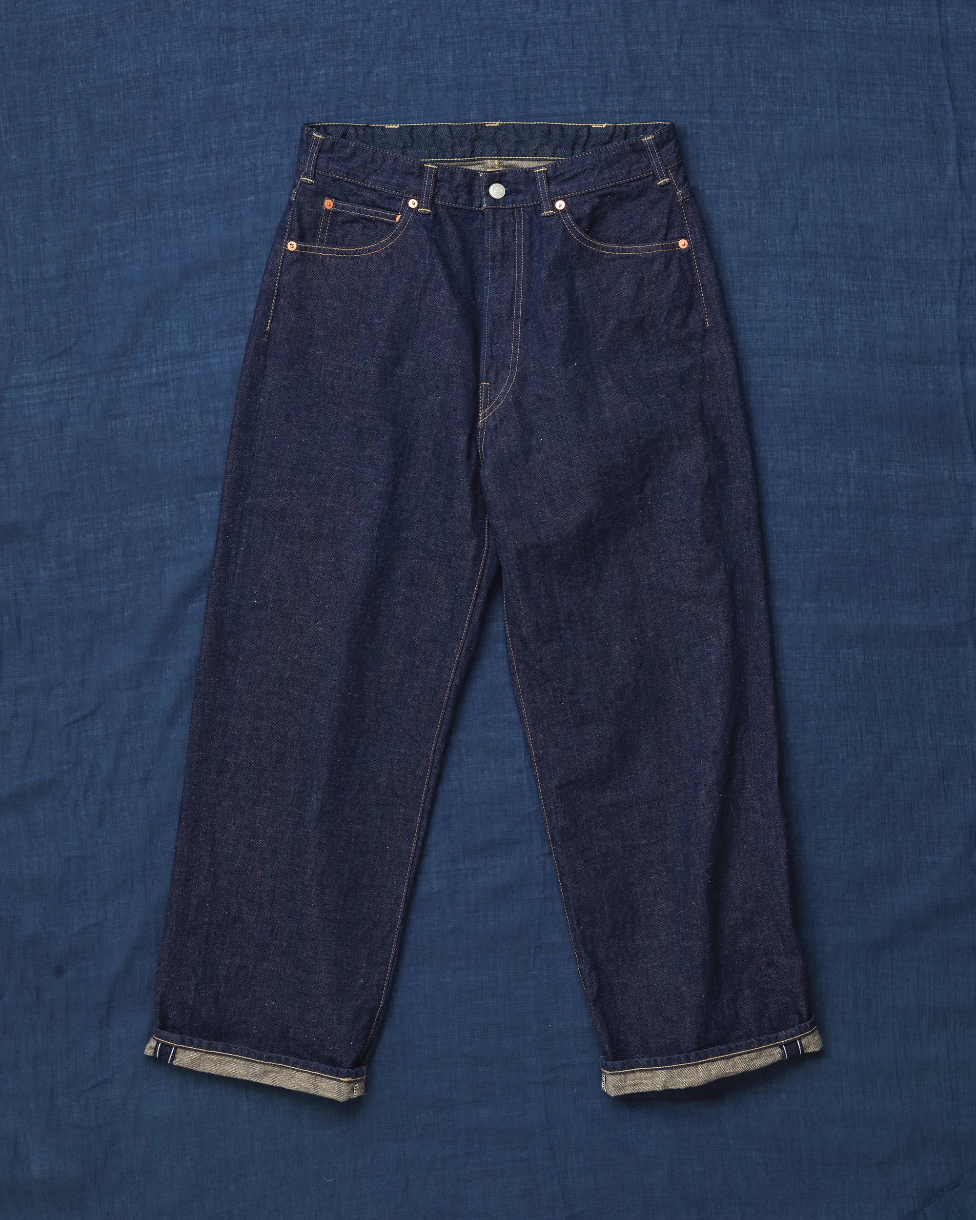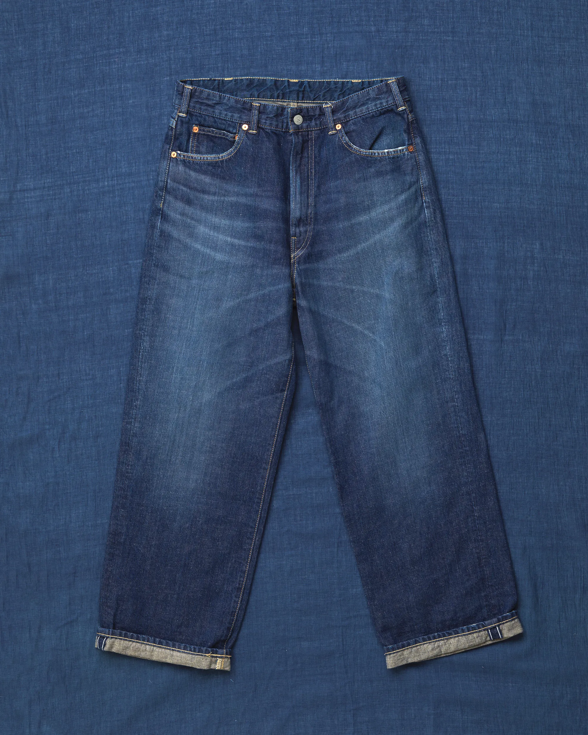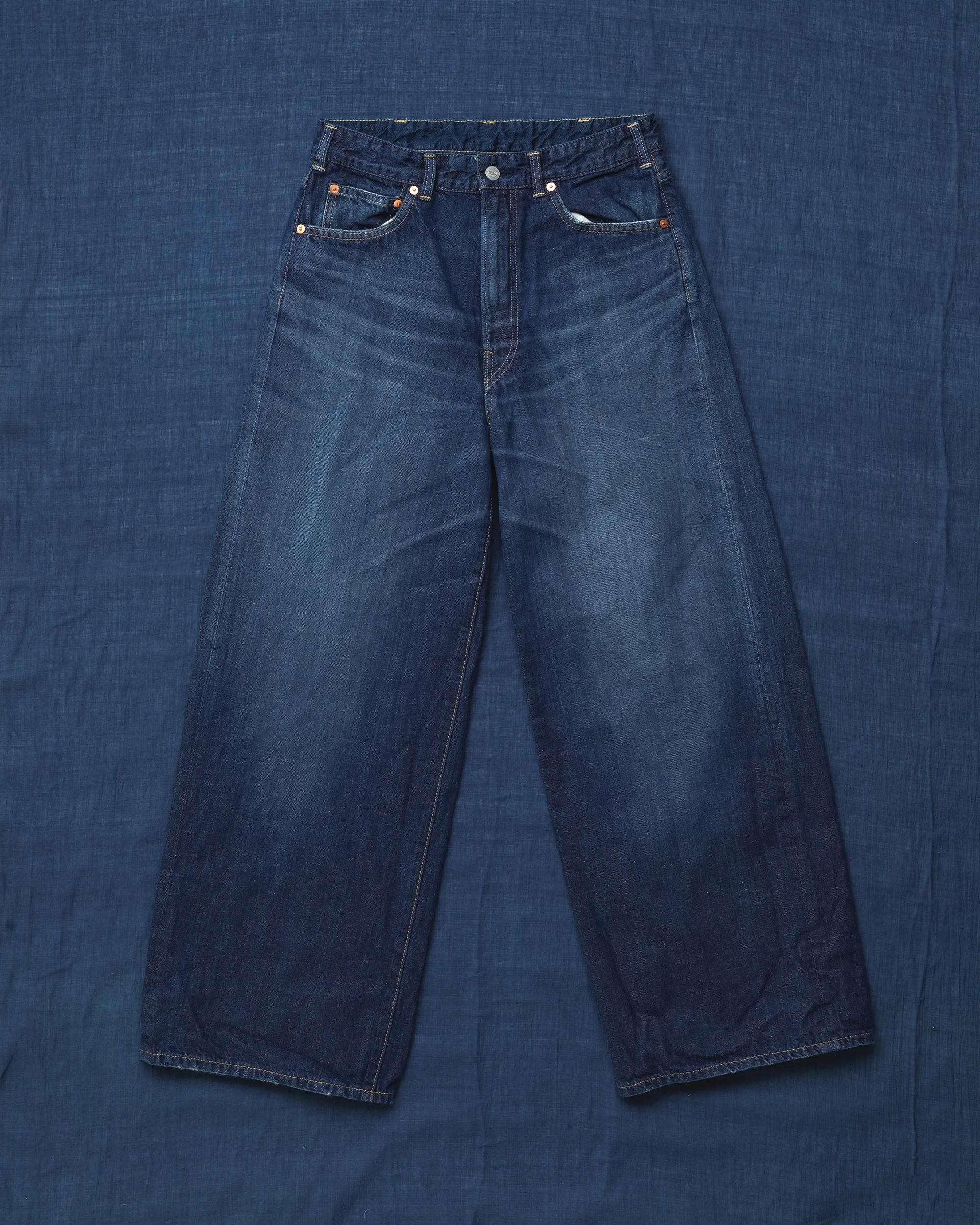 お披露目するのは、やわらかく穿きやすいライトオンスの藍デニム。かたちは45Rの定番、ややワイドな「シャルロット5」とバギーシルエットの「バチ比女」です。色はふたつとして同じ表情がなく、すべて手作業よる加工で、さまざまな色合いに仕上げました。